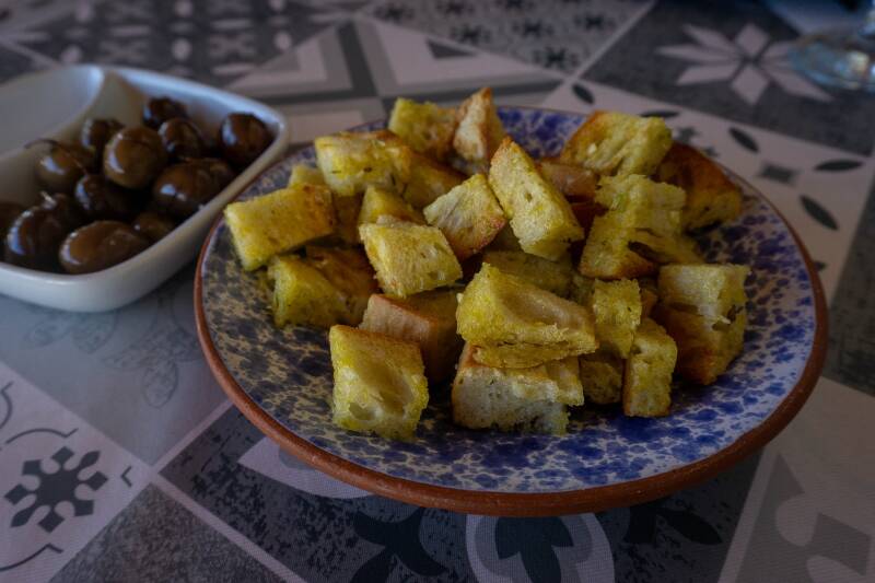 Os meus donos pediram uma entrada com azeitonas e torricado (gostei muito deste petisco), seguindo-se 1/4 de sopa da pedra (que está disponível em 1/4, 1/2 ou dose) e para rematar uma dose de enguias fritas.